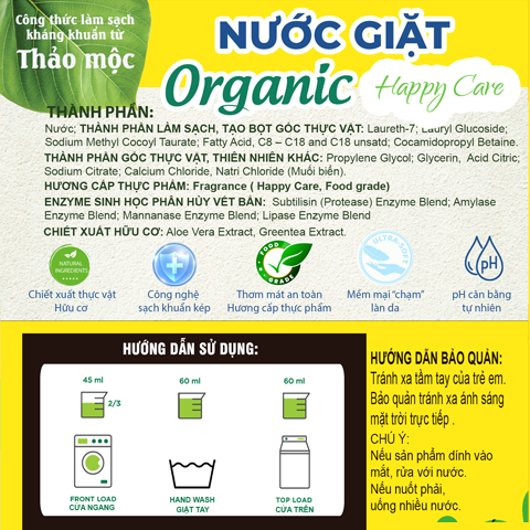 Nước Giặt Organic Happy Care là dòng sản phẩm giặt tẩy cao cấp của Mother and Son Herbal Care, ứng dụng công thức làm sạch từ thảo mộc, enzyme sinh học phân huỷ vết bẩn và chiết xuất nha đam – trà xanh giúp quần áo sạch sâu nhưng vẫn mềm mại và an toàn cho làn da nhạy cảm, đặc biệt là da em bé.