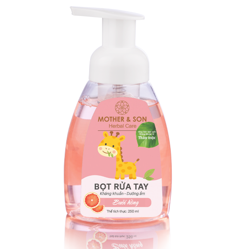 Bọt rửa tay Bưởi Hồng của Mother & Son Herbal Care được thiết kế đặc biệt cho trẻ nhỏ, giúp bé yêu thích việc rửa tay mỗi ngày. Công thức an toàn với thành phần có nguồn gốc từ thực vật, kết hợp tinh dầu bưởi và nha đam – vitamin E giúp làm sạch nhẹ nhàng mà không gây khô da.